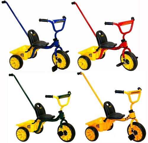 يتم تثبيت إطار معدني على Trike ، وعوضاً على الطراز ، عجلات قابلة للنفخ / البلاستيك.