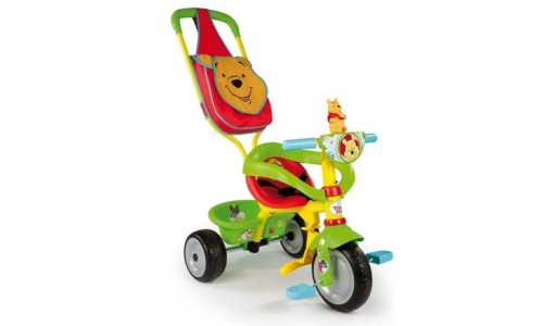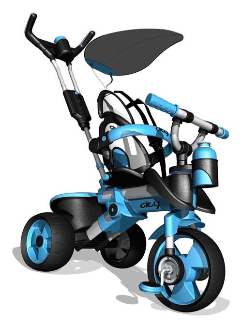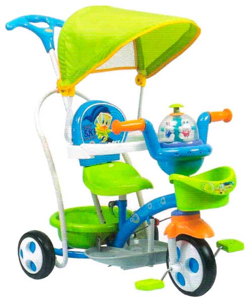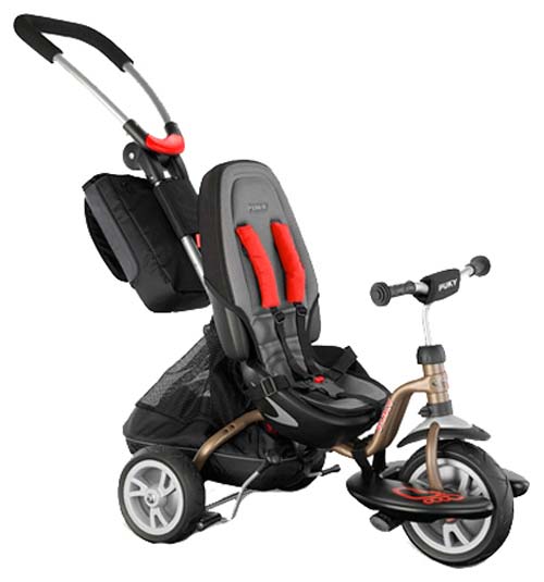يحتوي الكرسي المتحرك على مقعد أمان مجهز بأحزمة أمان. عن طريق دفع المقبض (عجلة القيادة) ، يمكن للوالد تحويله إلى دراجة ثلاثية العجلات حقيقية.