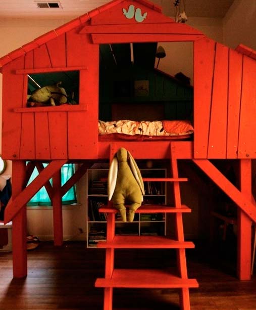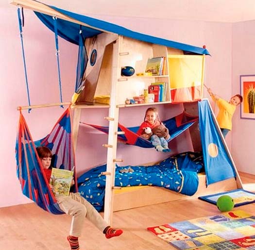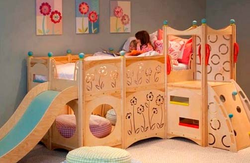 - منزل لعبة في مجمع مع سرير - الحل المثالي عندما تريد الجمع بين العمل والمتعة. في هذه الحالة ، لا يتم استخدام مساحة الغرفة أفقيًا ، بل عموديًا: هذا التصميم يشبه سريرًا بطابقين ، ولكن بدلاً من أحد "الطوابق" - غرفة للألعاب. يمكن تجهيز هذا المجمع بشريحة وسلالم ورفوف للكتب والألعاب والأراجيح والحبال. اتضح زاوية حقيقية من القصص الخيالية ، حيث يمكن للطفل أن ينام ويقضي الوقت بنشاط في ألعاب مختلفة.