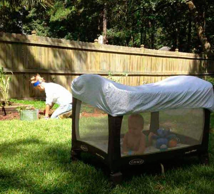 16. Cobriu el parc infantil del carrer amb un llençol per protegir el nadó dels insectes i la llum del sol.