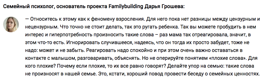 Mèrit: Els nostres fills no estan a la buit, no jueu a casa: així és com escolten les estores al carrer, a l'escola i a la televisió. No hi ha res a fer. Per desgràcia, aquest és un problema de la societat en general, i no un nen individual. Crec que és millor no tocar els més petits (si no us crideu l’atenció; no hi ha interès per al nen), els nens més grans (5-10 anys) poden explicar que aquestes paraules són dolentes, però no podeu fer res amb adolescents, encara que podeu intentar dir-li no val la pena parlar en família i en públic, però deixar-los comunicar amb els amics a porta tancada com vulguin.