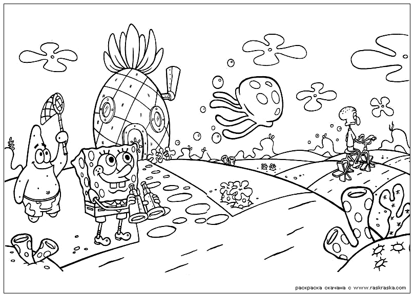 SpongeBob Squarepants: una de les sèries de dibuixos animats més populars del nostre temps. Les aventures del personatge principal SpongeBob i els seus amics sempre diverteixen als nens, per la qual cosa el nostre llibre de pintar SpongeBob definitivament no els deixarà indiferents. Baixar aquests llibres per pintar, com els que es presenten aquí, és molt senzill: cal guardar-los a l’ordinador i, simplement, imprimir-los en un full A4. Dóna-li al teu bebè uns retoladors de colors, pàgines per pintar i estigui assegurat: el teu fill estarà encantat de pintar els seus personatges preferits
