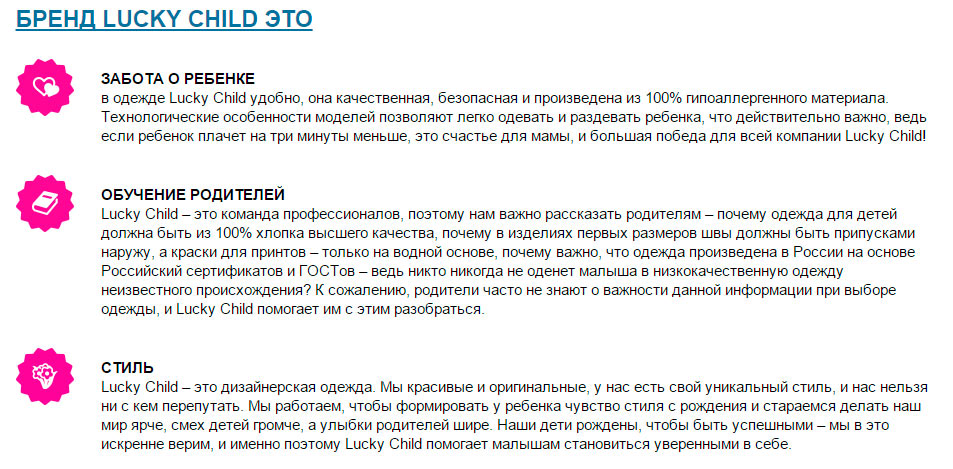 Cada cosa és una obra de disseny, cada model és original. Els dissenyadors de la marca creen combinacions harmonioses de colors i proporcions; aquestes peces ajuden a inculcar un bon gust al nen i a crear confiança en si mateix. El nen vestit amb Lucky Child trobarà ràpidament el seu estil quan creixi.