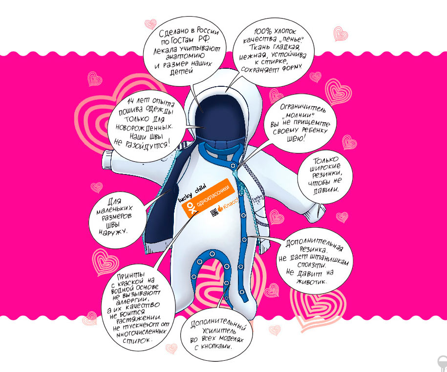 Coses per als més petits: només d’un suau 100% cotó. En els mantells, les corredisses, les bruses de les primeres mides, les costures només són externes, que no es freguen. A les cremalleres hi ha un limitador superior, per no pinçar el coll del nen. Els punys utilitzen bandes elàstiques suaus i amples que no pressionen. Els models amb botons estan reforçats, els fixadors no sortiran “amb carn”, a diferència de les superiors de moltes altres marques.