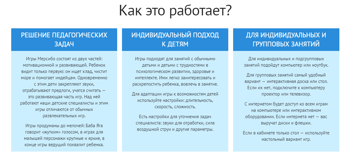 Projekt Mersibo je online zdroj, který kombinuje celou řadu online školicích materiálů. Je vhodné s nimi pracovat doma i v kancelářích učitelů a specialistů, mateřských školek. V nepřítomnosti internetu si můžete objednat aplikace na všech známých jednotkách (flash disk, disk). Hry Mercibo pomáhají zlepšovat řečové dovednosti, zlepšují paměť a funkce mozku, pomáhají dítěti rozvíjet slovní zásobu a obzory. Učí základy matematiky, čtení a psaní.