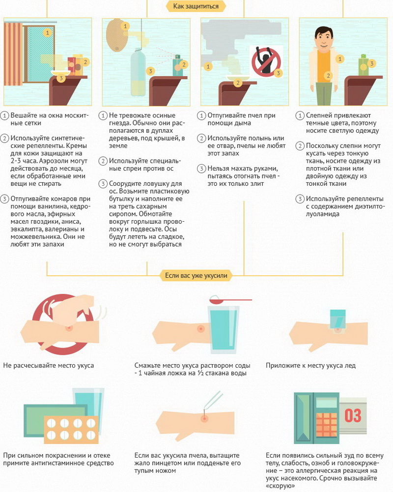 Mosquito bites, stings of bees, wasps, mosquitoes, midges are very painful. The bite site usually swells, turns red, and sometimes itches severely. Some children react to bee stings with a strong allergy, which manifests itself in swelling of the respiratory tract. If the child begins to breathe heavily, immediately call an ambulance.