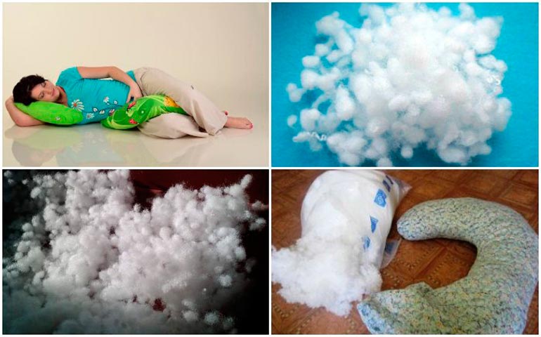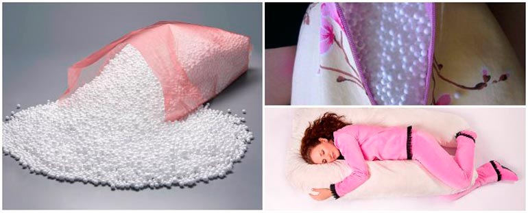 Poliestireno expandido - Un relleno muy interesante, que es una pequeña bola. Es absolutamente seguro, no está amenazado por garrapatas, moho y varios microorganismos. Una almohada llena de espuma de poliestireno tomará los contornos de su cuerpo, lo que le permitirá sentirse cómodo. Además, no se suelta.