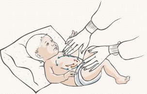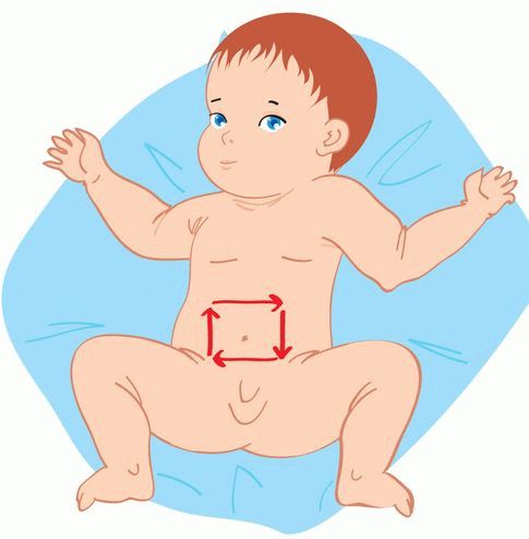 1. Primero, acaricie suavemente el estómago, aumentando gradualmente la presión, pasando a una ligera presión. Para hacer esto, doble las palmas de las manos con una "casa" para que la parte convexa de la "casa" se encuentre en el área del ombligo del bebé y realice movimientos de presión suavemente con las costillas de las palmas a lo largo del borde del abdomen. En este caso, se debe prestar especial atención a evitar la región del hipocondrio derecho: hay un hígado, que en los bebés sobresale ligeramente de debajo de la costilla inferior. Luego, debe hacer varios movimientos de presión de derecha a izquierda (por lo tanto, en el cuerpo del bebé se va el intestino grueso). Después de cada movimiento, debe realizar movimientos lentos y suaves para acariciar.