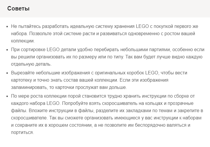 10. Pour organiser un système de stockage efficace, il n'est pas superflu de signer chaque conteneur: il sera plus facile de rechercher les détails nécessaires, puisque vous n'avez pas à regarder dans chaque conteneur ou boîte. Et pour ne pas perdre les instructions pour Lego et savoir quel modèle de jouets vous avez, vous pouvez créer un dossier spécial avec des fichiers.