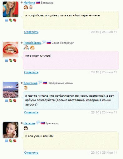 Ho provato il melone quando mia figlia aveva 4 mesi, il primo pezzo del primo giorno non ho notato reazioni negative, quindi il secondo giorno mi sono permesso di più. Anche se, mi sembra, la cosa principale in ogni questione è conoscere la misura.