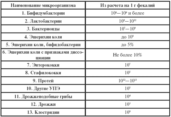 Idealmente, nei bambini completamente allattati al seno, la microflora intestinale è composta per il 95-99% da lattobacilli e bifidobatteri (i cosiddetti probiotici). E solo una parte insignificante è costituita da batteri "neutri" (obbligati), che non hanno né effetti dannosi né benefici sul corpo del bambino. Questi includono streptococchi, enterococchi, micrococchi, clostridi, batteroidi ed Escherichia coli.