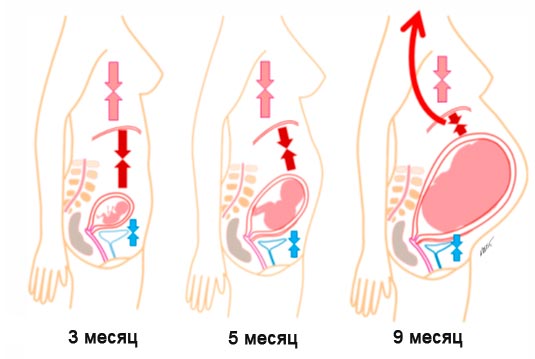 - Dzemdes augšana samazina vietu vēdera dobumā, tai skaitā samazina kuņģa tilpumu un nospiež skābi barības vadā.