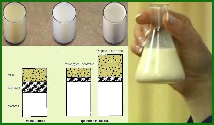 - Priekšpusē - zilgans un šķidrs - izdalās pirmajās barošanas minūtēs, un ogļhidrāti, sāls un ūdens satur slāpes.