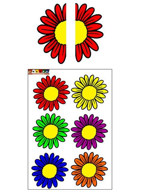 Permainan "Flower Halves" juga ditujukan untuk kanak-kanak berumur 2-3 tahun. Dia mengembangkan persepsi holistik terhadap warna. Anak perlu memilih warna bahagian-bahagian warna. Anda boleh memuat turun gambar pada pencetak warna dan memotongnya.