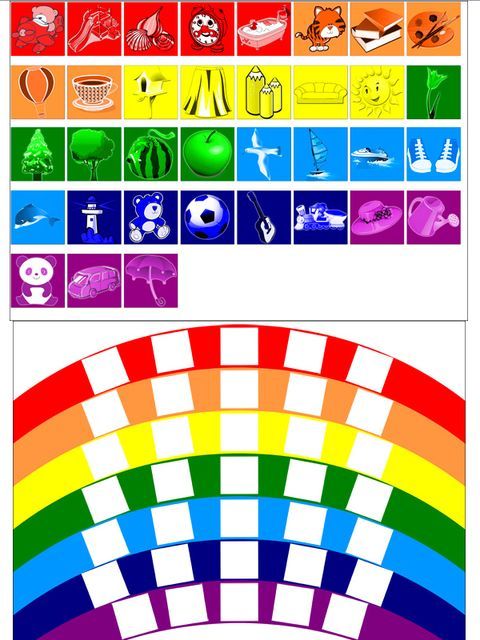 "Hooray. Pelangi ". Permainan ini untuk kanak-kanak berumur 2-3 tahun. Kanak-kanak itu perlu dengan betul, memilihnya mengikut warna, meletakkan gambar di pelangi.