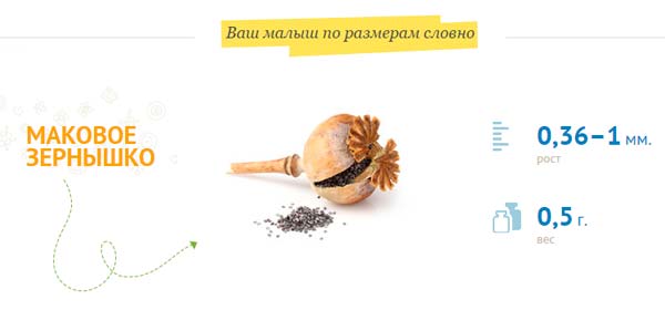 Wielkość przyszłego płodu w 4. tygodniu położniczym jest porównywalna z „makiem”. Jego waga wynosi około 0,5 g, a wysokość 0,36–1 mm. Są to jednak dosłownie dane chwilowe. Zarodek szybko rośnie z powodu stałego podziału komórek.