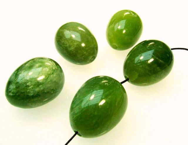 Jadeitowe jajka - Pierwsze symulatory pochwy, które były używane w czasach starożytnych. To dobry dodatek do ćwiczeń Kegla. Prawdziwy jadeit ma działanie antybakteryjne. Jednak trening z jajami jadeitowymi wymaga odpowiedniej techniki, w przeciwnym razie możesz rozluźnić i rozciągnąć wrażliwe mięśnie pochwy. Warto pamiętać, że prawdziwy naturalny jadeit jest dość drogi, dlatego często można znaleźć podróbki wykonane z tanich materiałów. W wyniku zastosowania takich jaj pojawiają się podrażnienia błony śluzowej i nieprzyjemne wydzielanie, ponadto podróbki, w przeciwieństwie do prawdziwego jadeitu, są porysowane i rozdrobnione i mogą uszkodzić delikatne narządy.
