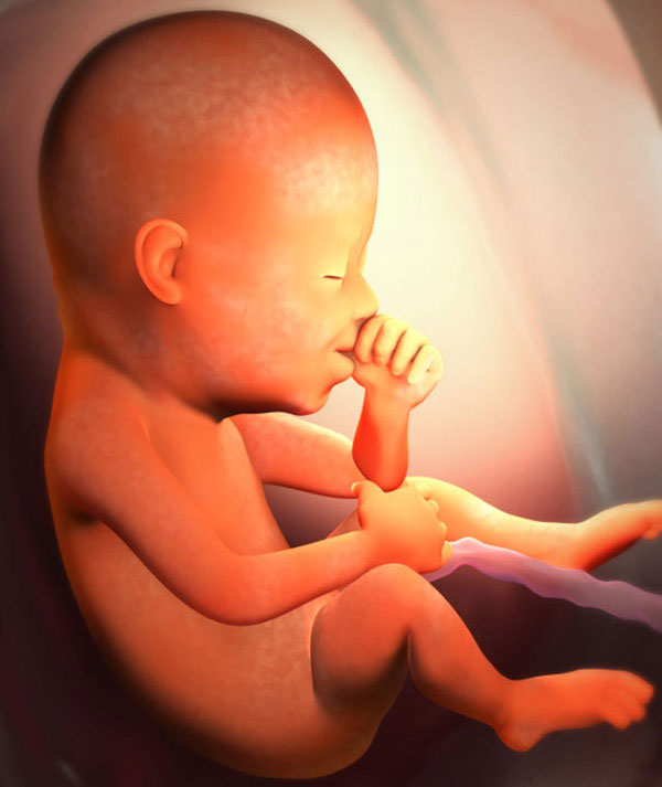 Agora, a principal tarefa do feto é crescer e ganhar peso. O garoto parece um homenzinho. Em proporções do corpo, ele já se assemelha a um recém-nascido. Se seu bebê está destinado a nascer com pêlos na cabeça, então nessa época eles aparecem. Pequenas sobrancelhas e cílios já estão lá, mas é mais provável que não sejam pêlos, mas um cotão leve. Seu filho está constantemente treinando. Pelos sinais do cérebro, o feto literalmente realiza os movimentos de que precisará primeiro.