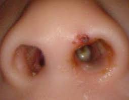 - secreção purulenta (às vezes com sangue) e odor putrefativo aparecem no nariz;