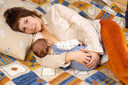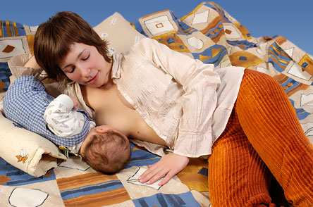 Uma variante dessa postura está se alimentando da parte inferior do peito enquanto está deitado. O garoto está deitado ao lado dele, cara a cara com a mãe. Ao mesmo tempo, a mãe remove o braço sob a cabeça. Se, no primeiro caso, a mãe apóia o bebê com a mão, nesta versão o bebê deve ser apoiado com um travesseiro, para que ele fique de lado e não role de costas.
