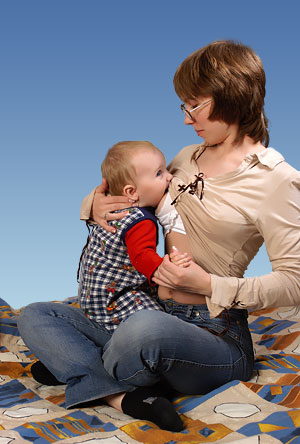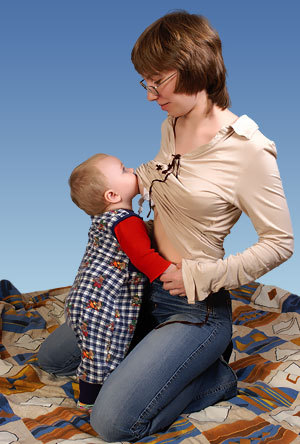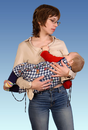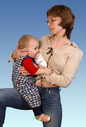 Os filhos mais velhos não gostam mais de mentir. Assim que o bebê dominar o assento - você pode alimentá-lo, sentando-se em cima dele, com o princípio de "estômago com estômago". Nesta posição, é muito conveniente trocar o tórax: não há necessidade de rolar, mudar a criança. Esta posição é especialmente conveniente ao alimentar durante um resfriado. Na posição vertical, é menos provável que o nariz seja colocado, por isso é muito mais fácil e mais confortável para um bebê mamar um seio, deitado por semanas.