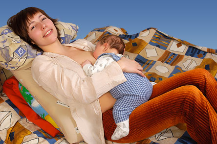 A postura para alimentar-se deitada dá à mãe a oportunidade de relaxar as costas e descansar de uma posição ereta. Mãe e bebê estão deitados de lado, um de frente para o outro. É melhor colocar o bebê em um travesseiro, para que ele seja mais alto e mais fácil para ele alcançar o peito. Uma criança mais velha pode ficar sem travesseiro. Com a mão "inferior", a mãe abraça o bebê para que a cabeça dele repouse na mão dela. Essa pose é conveniente para dormir juntos.
