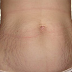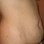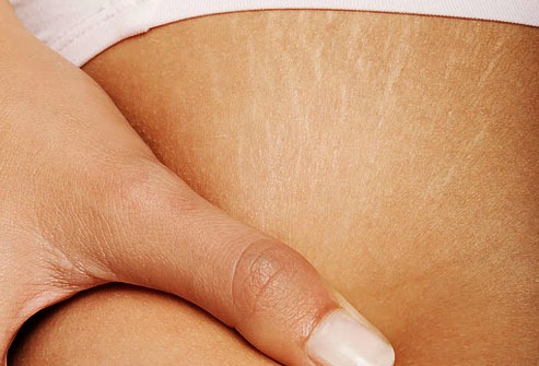 O rápido alongamento da pele leva ao fato de que, com a falta de elasticidade, ocorrem lágrimas na camada profunda da pele. Isso leva ao aparecimento de estrias, que inicialmente têm uma cor bordô e, depois que as estrias ficam cobertas de tecido conjuntivo, ficam com uma cor rosa desbotada (mais clara que a pele ao redor).