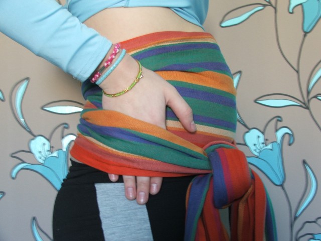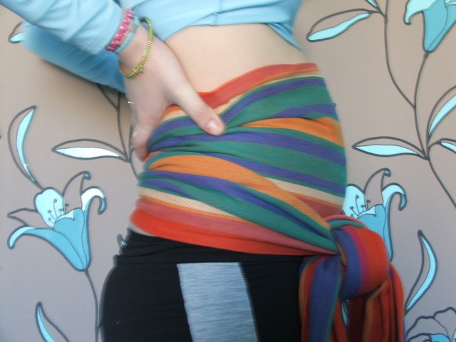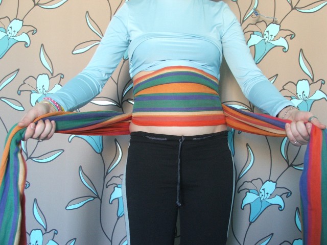 - Trazemos duas pontas estreitas sob o abdômen inferior, amarramos um pouco ao lado. O resultado é uma segunda faixa estreita, que suporta o estômago.