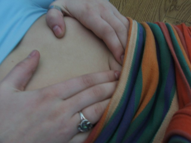 - Colocamos as mãos sob uma faixa larga o mais fundo possível, "espalhamos" o estômago em um "bolso" sobre uma fita estreita. Levante-se com cuidado.
