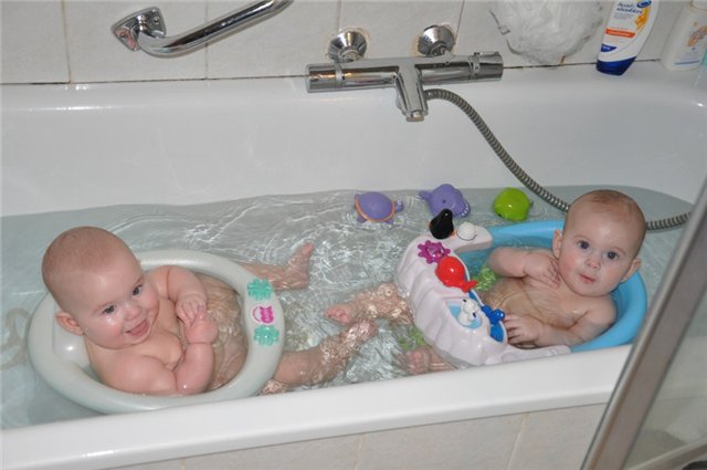 Quando os gêmeos podem sente-se sozinhoentão a natação pode ser feita em conjunto. Aqui é onde a verdadeira diversão começa. Abasteça os brinquedos - os procedimentos com a água proporcionam muito mais prazer às crianças quando, juntas, você pode brincar com uma água morna e brincar umas com as outras. Se ambos os pais tomam banho, depois dos procedimentos na água, os bebês podem ser aplicados simultaneamente ao seio - porque a alimentação conjunta após o banho só contribuirá para o acostamento a um regime.