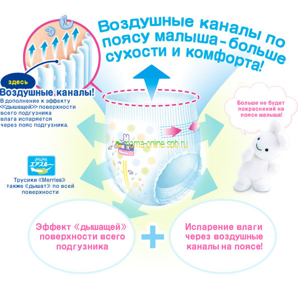 Devido à forma anatômica, a calcinha não esfrega a área entre as pernas. O fabricante cuidava dos meninos e meninas, colocando a camada absorvente mais alta para o primeiro e no centro para o último. Essas calcinhas diferem de modelos semelhantes, pois com um movimento são transformadas em fraldas clássicas (e vice-versa). Pelo mesmo motivo, eles não são difíceis de remover.