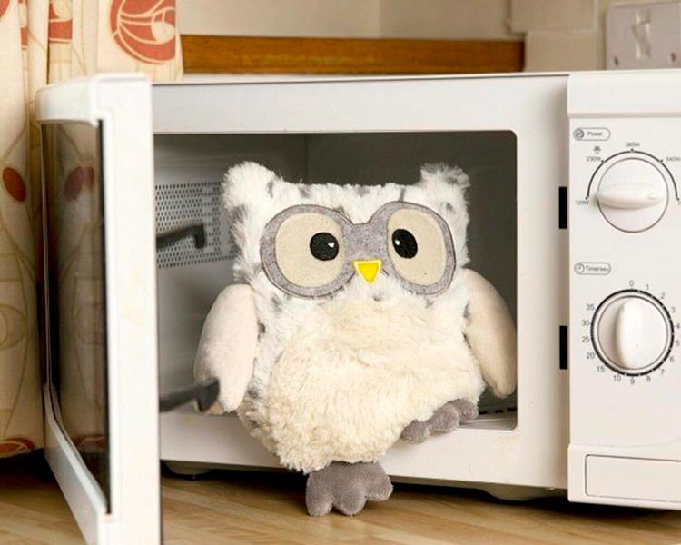 O brinquedo da almofada de aquecimento é aquecido no forno ou no microondas e, em seguida, aplicado à barriga do bebê. Para não queimar acidentalmente uma criança, primeiro é necessário verificar se a almofada de aquecimento ficou muito quente.