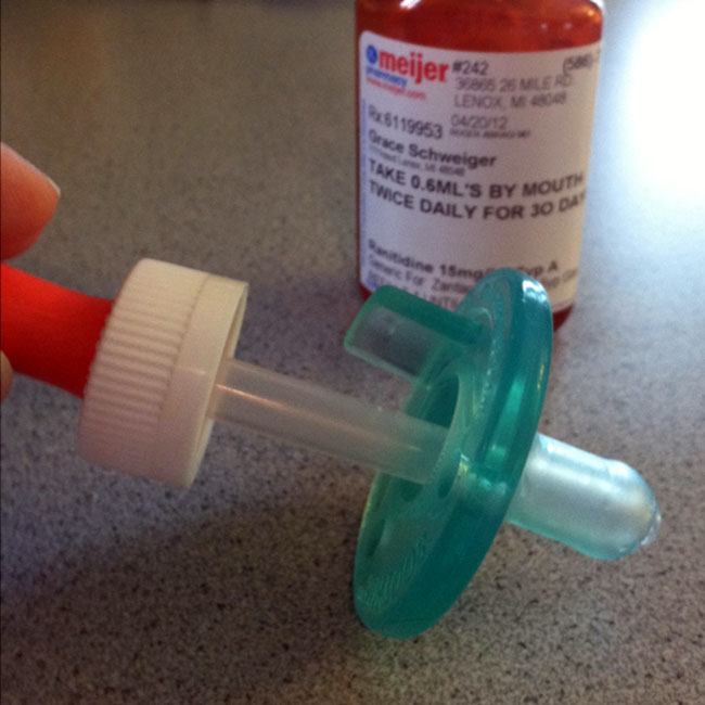 - Com um boneco: ou o manequim é mergulhado no remédio e administrado ao bebê ou é preenchido com remédio (você pode fazer um orifício no mamilo e inserir o conta-gotas lá. Veja a figura abaixo.) No primeiro caso, mergulhe o manequim e deixe a criança lambê-lo até que toda a quantidade necessária de medicamento tenha sido tomada.