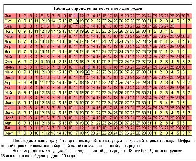 Du kan ta reda på om DA genom att använda den speciella graviditetskalendern för den senaste månaden. I den röda linjen letar vi efter datumet för början av den sista menstruationen, bredvid den, i den gula linjen, ser vi datumet för den troliga förlossningsdagen.