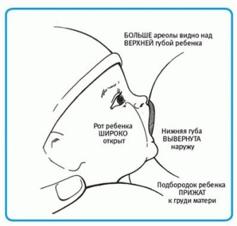 Den nyfödda bör placeras nära bröstet. Han borde röra vid botten av hakan, men ändå kunna öppna munnen så bred att han grepp bröstvårtan med areolan. Om barnet kommer att beröra botten av bröstvårtan med underläppen, ta försiktigt bort det från bröstet, luta huvudet bakåt och fäst det igen. Detta är den bästa positionen för utfodring, där kvinnan inte känner smärta.