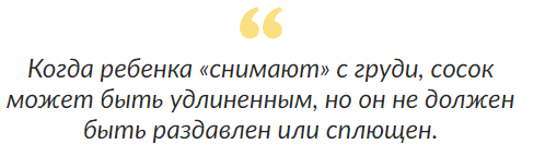 Efter matningen, när barnet "tas bort" från bröstet, är bröstvårtan långsträckt, men den får inte se krossad eller platt.