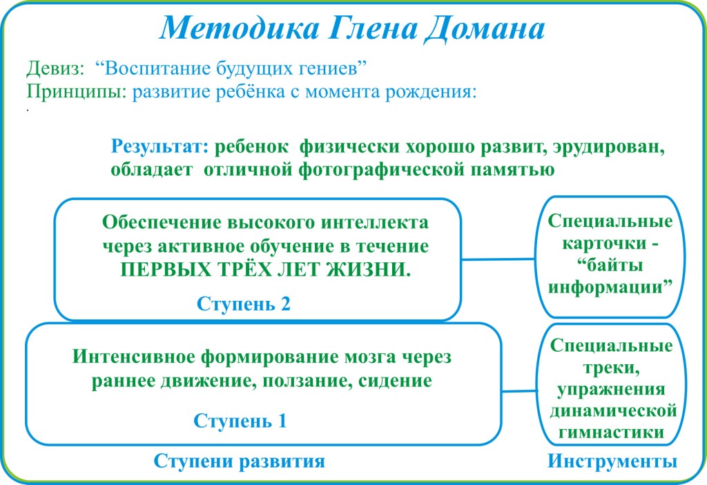 Ang pangunahing ideya, na nasasalamin sa pagbuo ni Glenn Doman, ay ang pangunahing tagapagturo ng bata ay ang kanyang mga magulang. Ang mga ito ay dapat na linawin sa kanilang anak na tanggapin nila siya para sa kung sino siya at gawin ang lahat upang mapabuti siya. Hindi na kailangang magpataw ng mga aktibidad sa pre-school kung ayaw niya ito o kung mabilis siyang pagod sa kanila. Ang lahat ay may oras nito. Marahil sa ibang pagkakataon siya mismo ay magpapakita ng interes sa proseso ng pag-aaral.