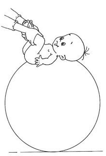 Nous avons mis le bébé sur la fitball avec son ventre vers le bas pour qu'il repose ses mains sur le ballon. Nous prenons l'enfant par les jambes comme si nous roulions une brouette et le balançons légèrement d'avant en arrière.
