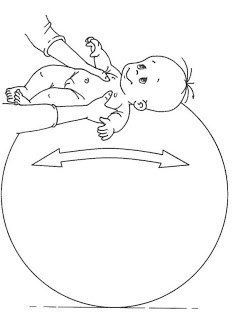 Nous couchons le bébé sur le ventre de fitball. Nous posons une main sur son dos, l'autre tient les deux jambes et commence à basculer doucement d'avant en arrière, de gauche à droite.